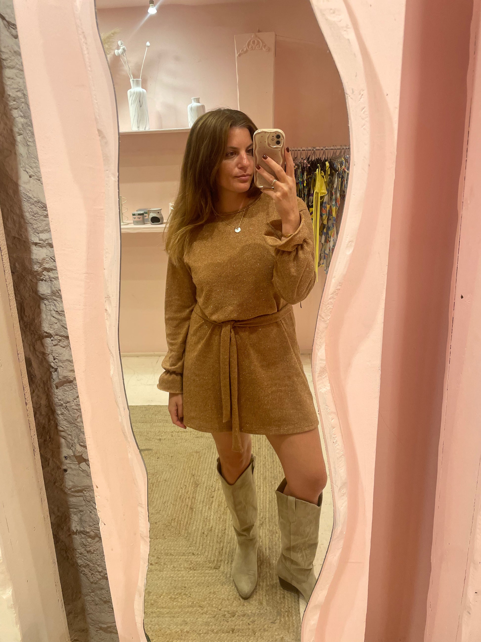 Ένα μίνι φόρεμα με μακριά μανίκια που σφίγγουν στον καρπό για θηλυκή σιλουέτα. Συνοδεύεται από έξτρα ζωνάκι ώστε να φοριέται με ή χωρίς, ανάλογα με τη διάθεση. Το ελαστικό knit ύφασμα με χρυσοκλωστή χαρίζει διακριτική λάμψη και κομψότητα, ιδανικό για μέρα και βραδινές εμφανίσεις.