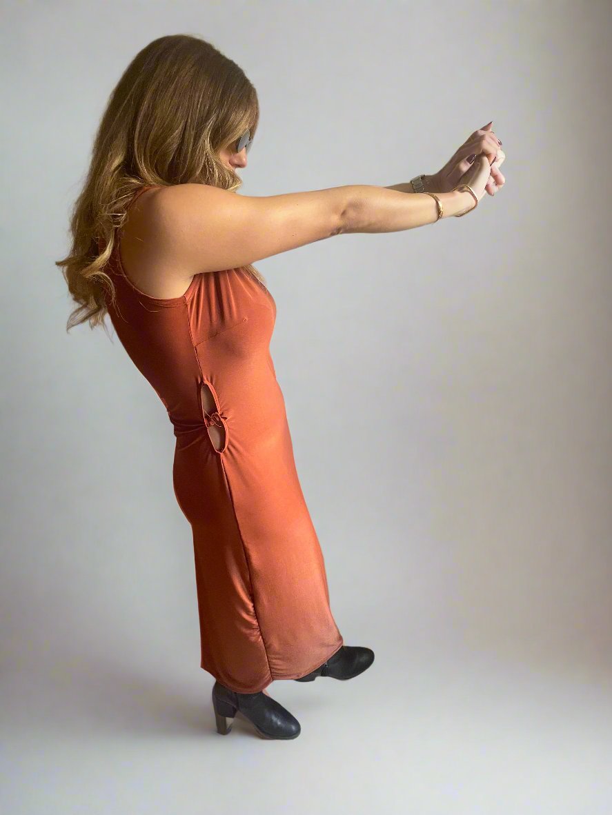 Alicia Caramel Cutout Midi Dress - features a sleek, straight-line design with bold side cutouts. Made from comfortable Lycra, it offers a flattering fit for both day and evening wear.
