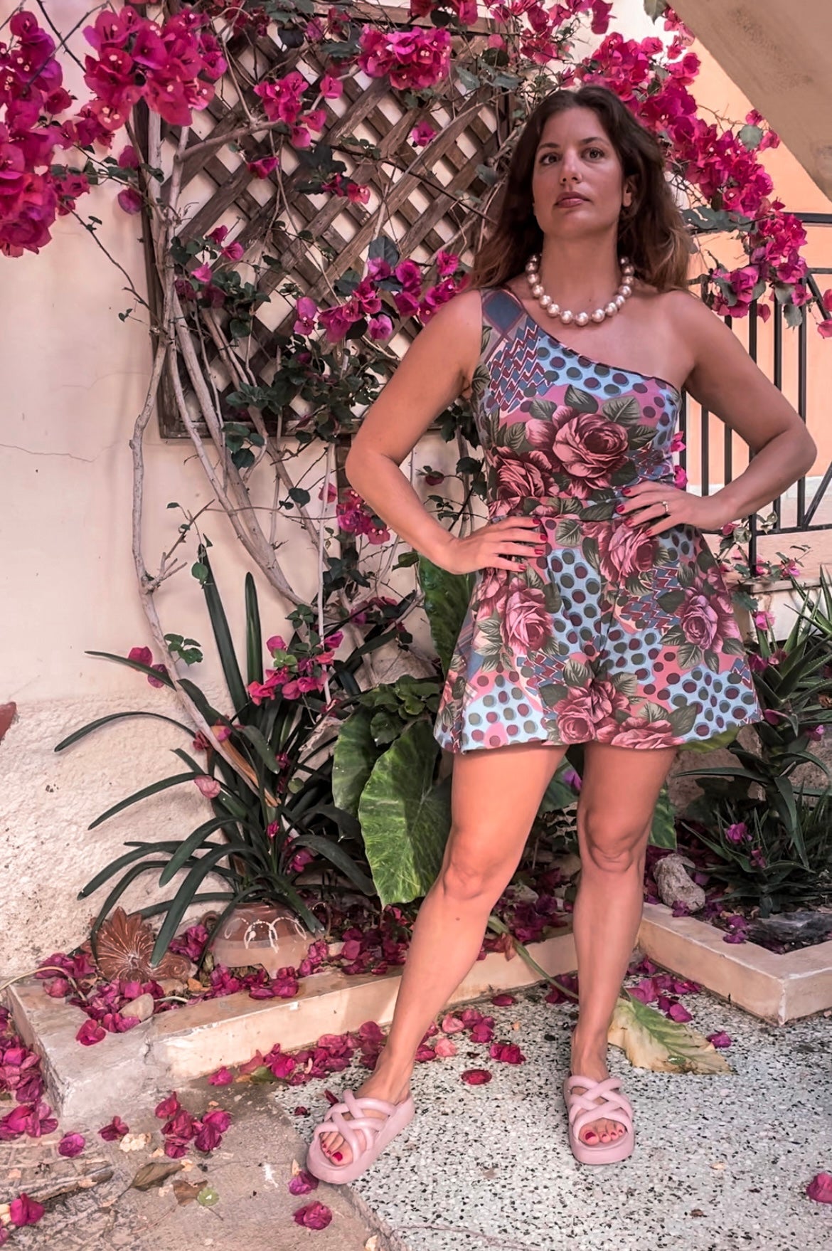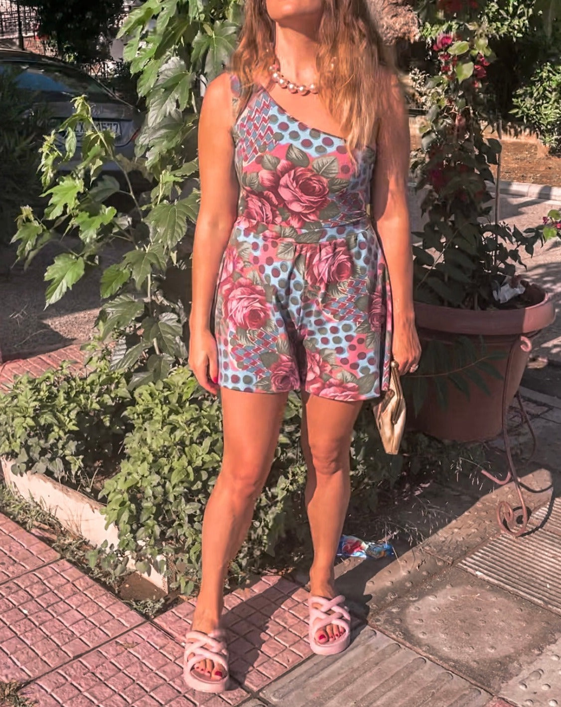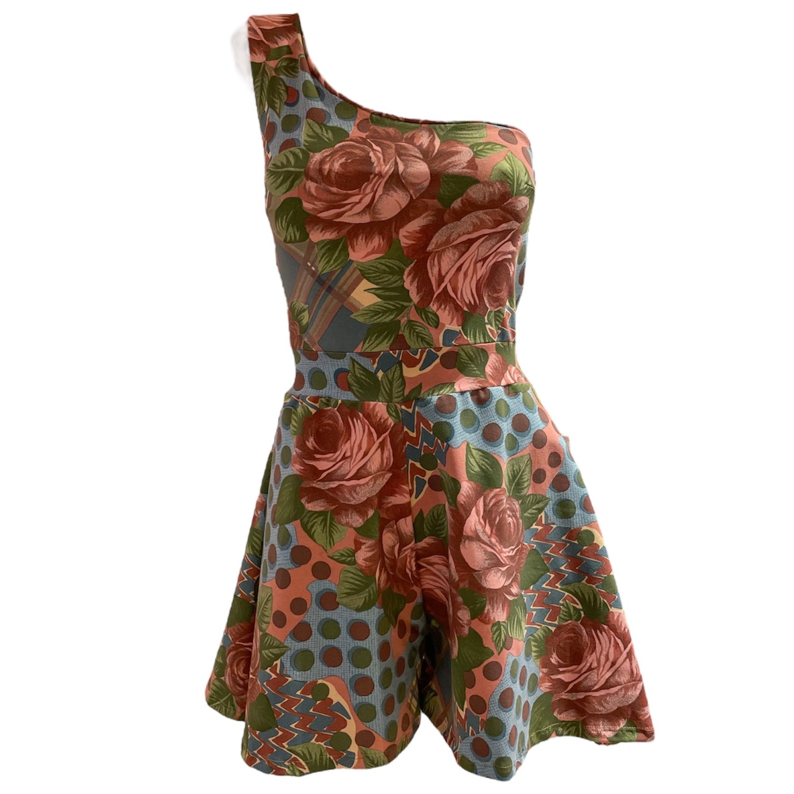 Strut your stuff in style with the Dassia Playsuit! Made of cotton lycra, this one-shoulder beauty has roses and polka patterns in grey blue and pink colors for a look that'll have heads turning. Perfect for a night out, or just when you feel like being extra fashionable! (It'll be a "polkadot on the i" moment, if you know what we mean!)
