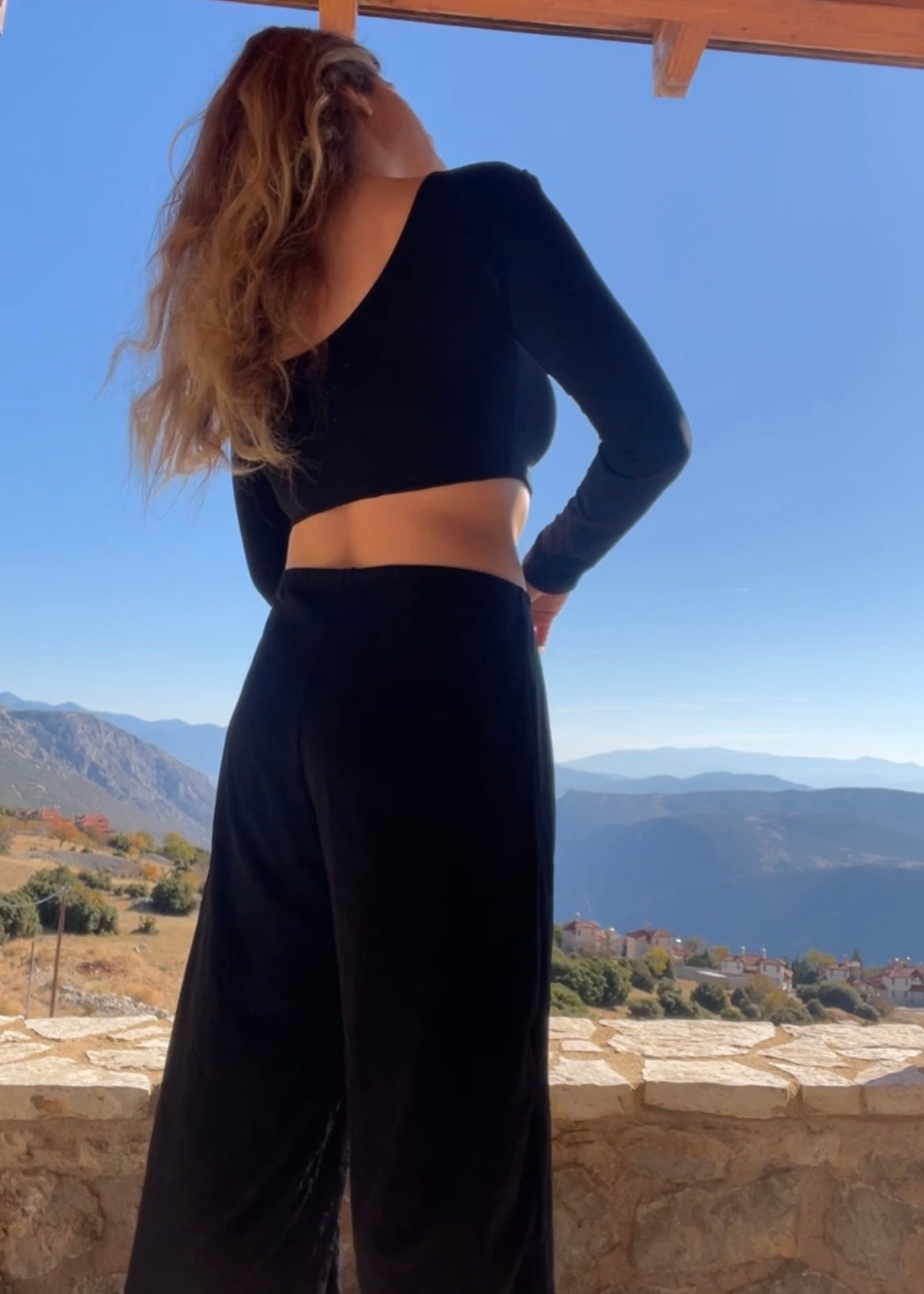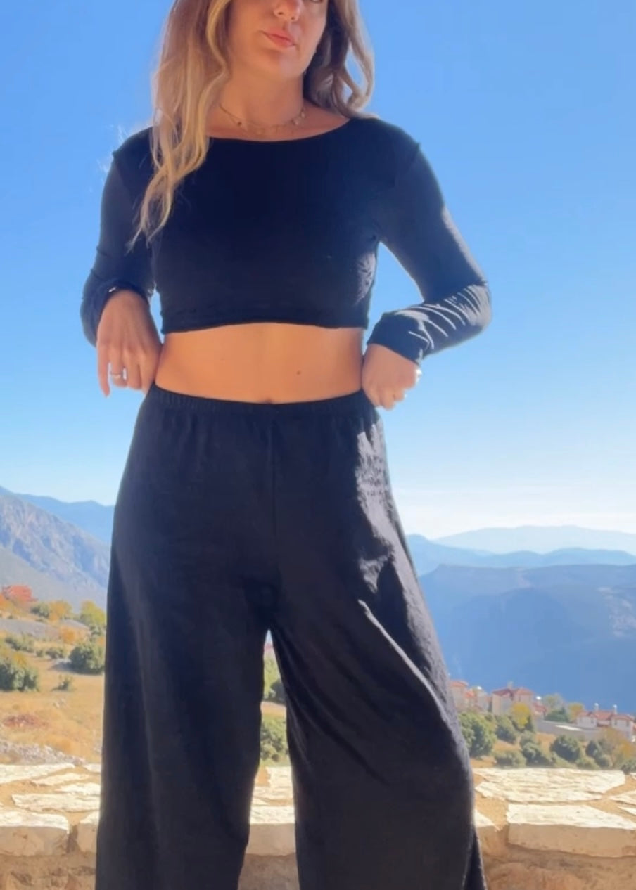 Παρουσιάζουμε το Cropped Top σε απόλυτο μαύρο χρώμα με εντυπωσιακό σχέδιο λουλουδιών! Αυτό το πολυμορφικό κομμάτι διαθέτει μακριά μανίκια και μπορεί να φορεθεί με δύο τρόπους: είτε με ανοιχτή U-shaped πλάτη είτε με U-shaped V για μια κομψή εμφάνιση.