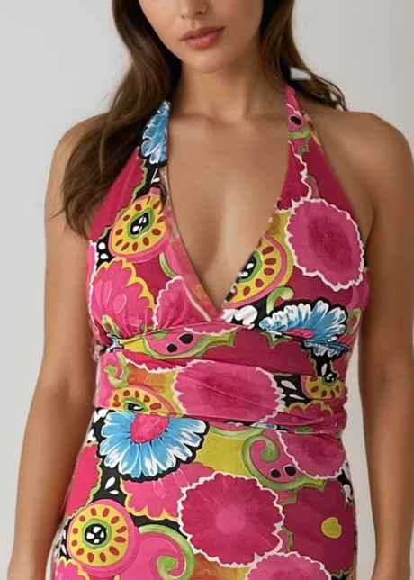 Top style: Halter neck, ties at the neck