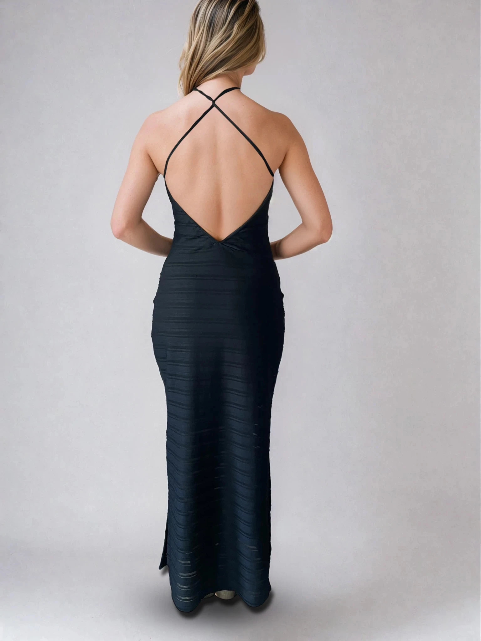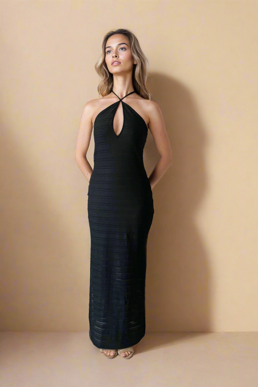 A statement maxi dress made of stretch lycra with delicate see-through stripe detailing. Featuring a halter neckline that ties at the neck and a subtle front keyhole cut-out. The silhouette hugs the body before falling into a straight-line skirt. The back is open.
