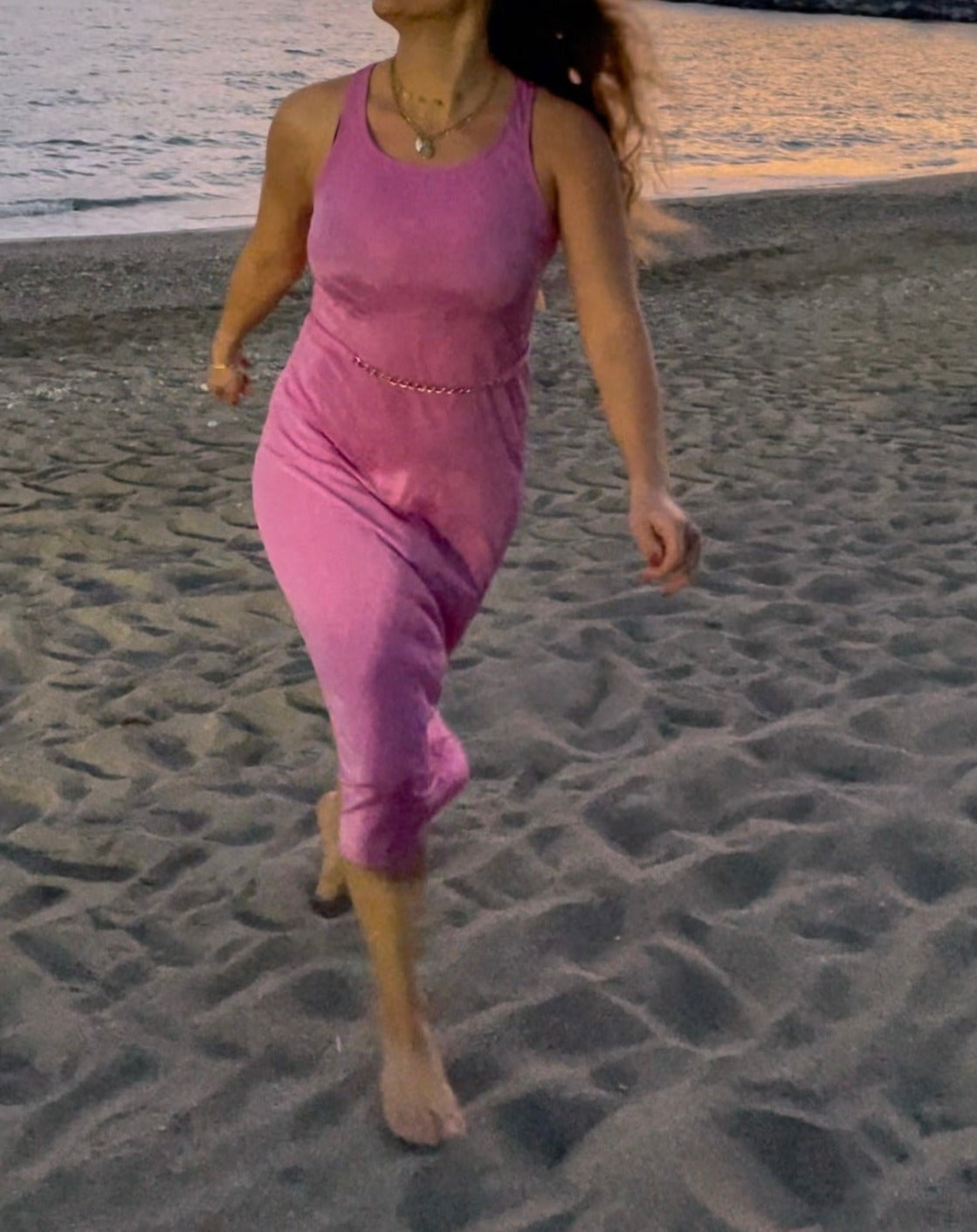 A dress made to accompany you every season, to every occasion. Perfect to dress up or down. An elastic and comfortable midi dress with no zippers or buttons so you can feel as comfy as possible as it just takes the shape of your body and highlights its beauty. Comes with a gold small chain to add a little bit of something which you wear also as a necklace. The length is midi to make it perfect for any occasion from walks in the city to date nights and picnics.