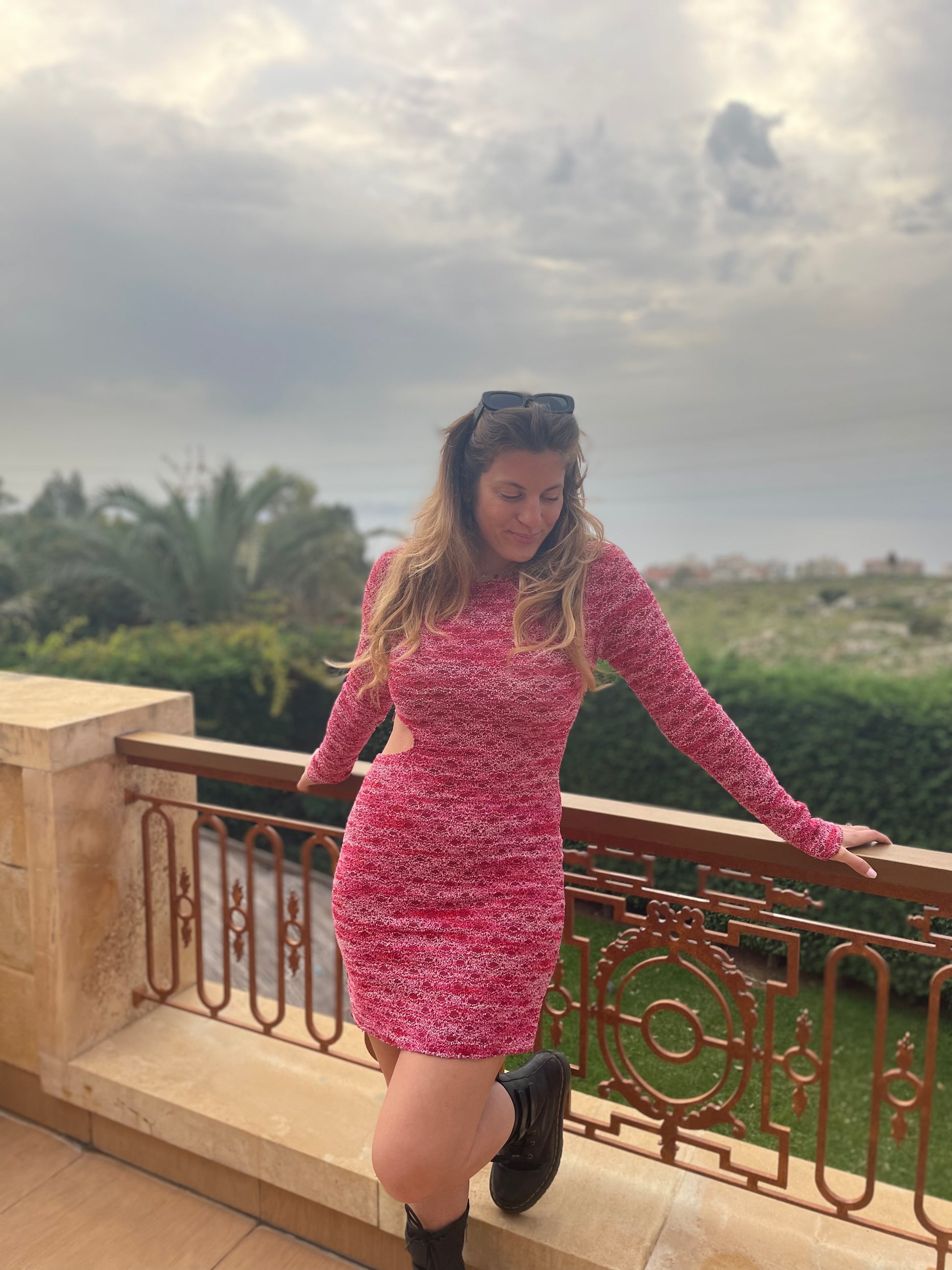 Stretchy mini dress with sheer details, long sleeves, and waist cutout. No zippers or buttons for a flawless, body-hugging fit.