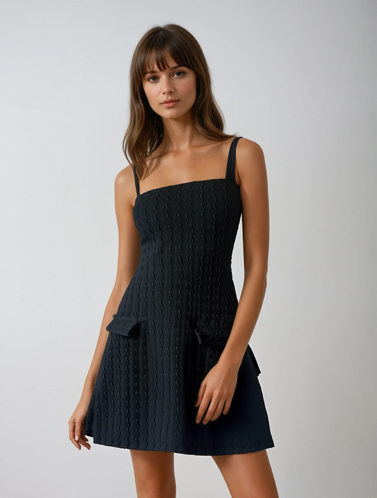 Textured Black Mini Dress – A chic sleeveless mini dress with a square neckline, structured straps, and a flared A-line silhouette. Designed with a subtle textured pattern and decorative pocket flaps for a refined touch.
