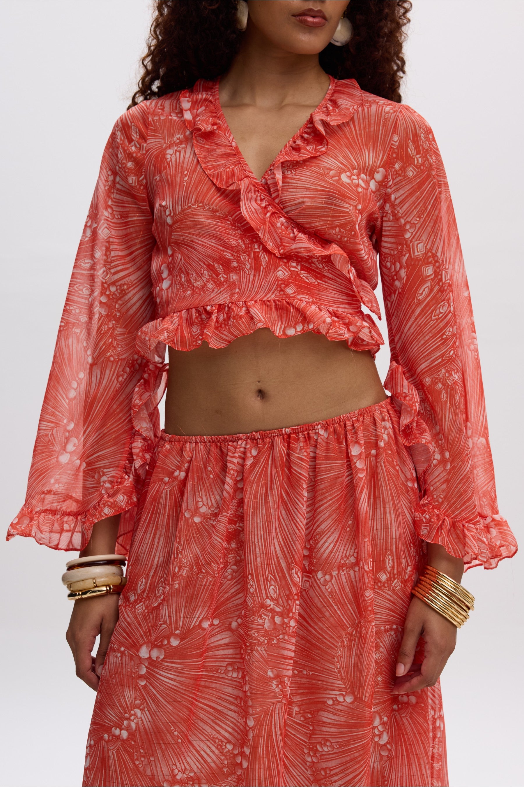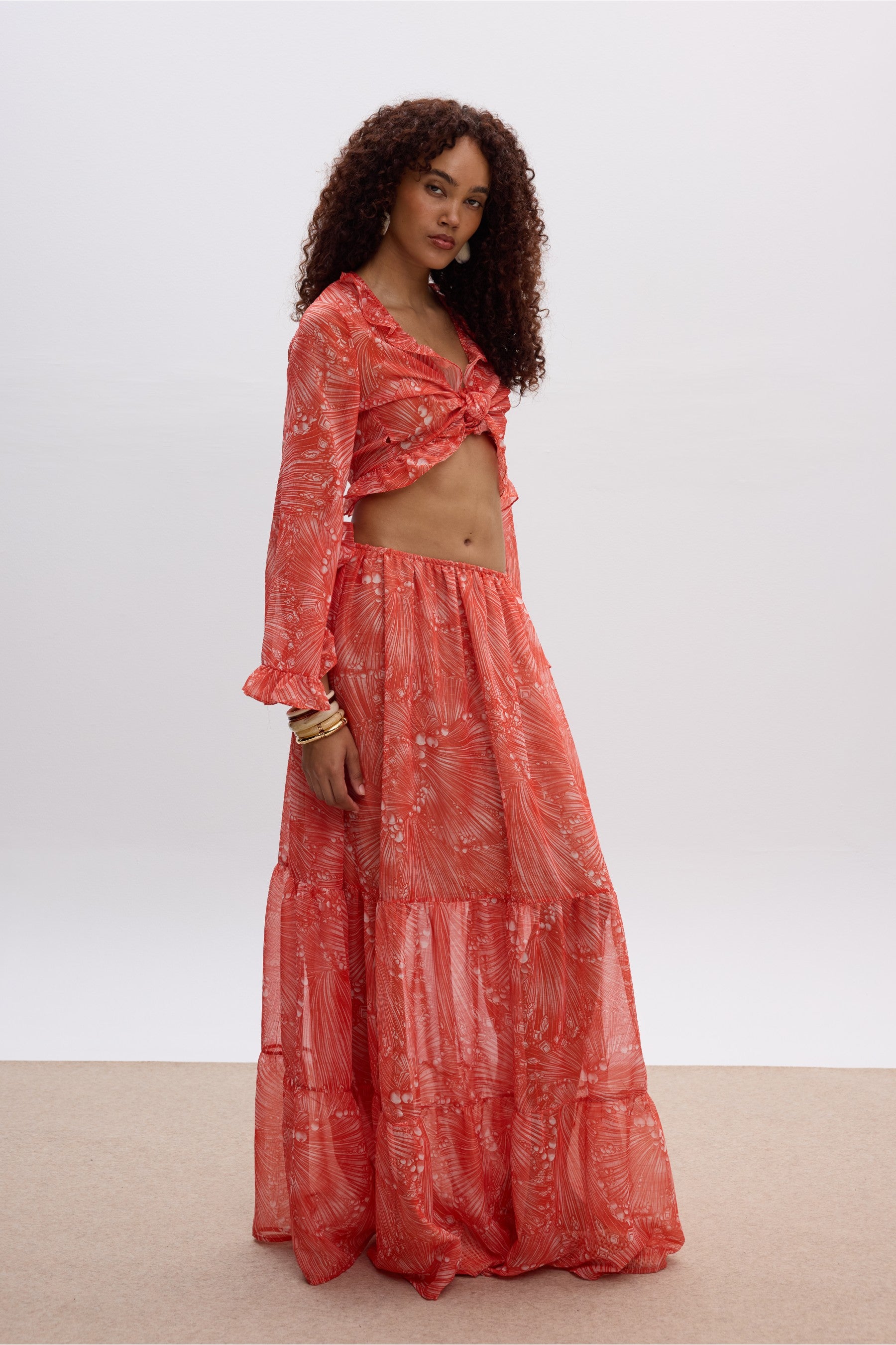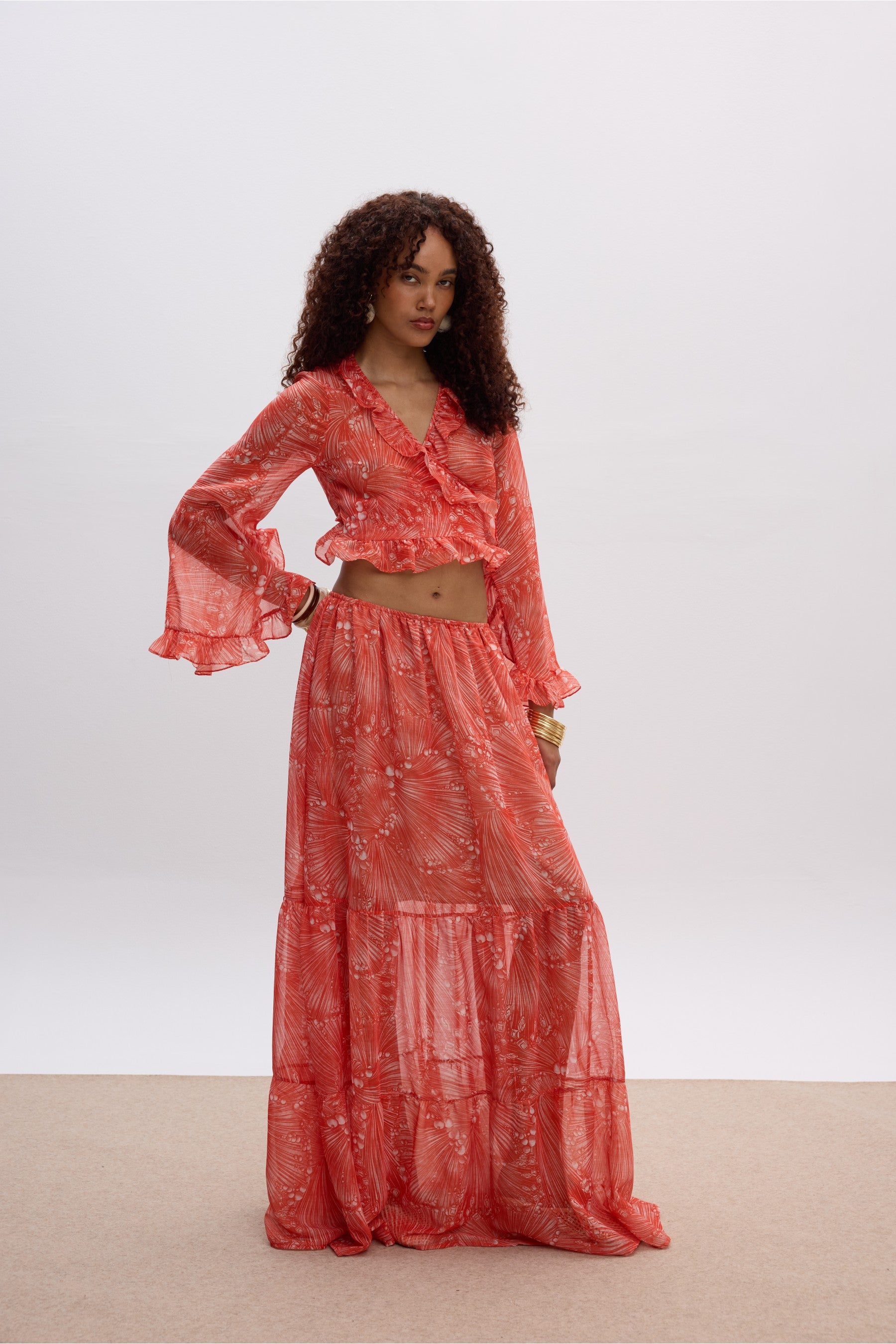 Radiate effortless bohemian charm with the Desert Sun Set. Crafted from lightweight, sheer fabric in a vibrant sun-kissed hue, this matching two-piece set is designed to move beautifully with you. The ruffled crop blouse pairs perfectly with the flowing tiered maxi skirt, making it ideal for beachside getaways, summer festivals, or sunset soirées.