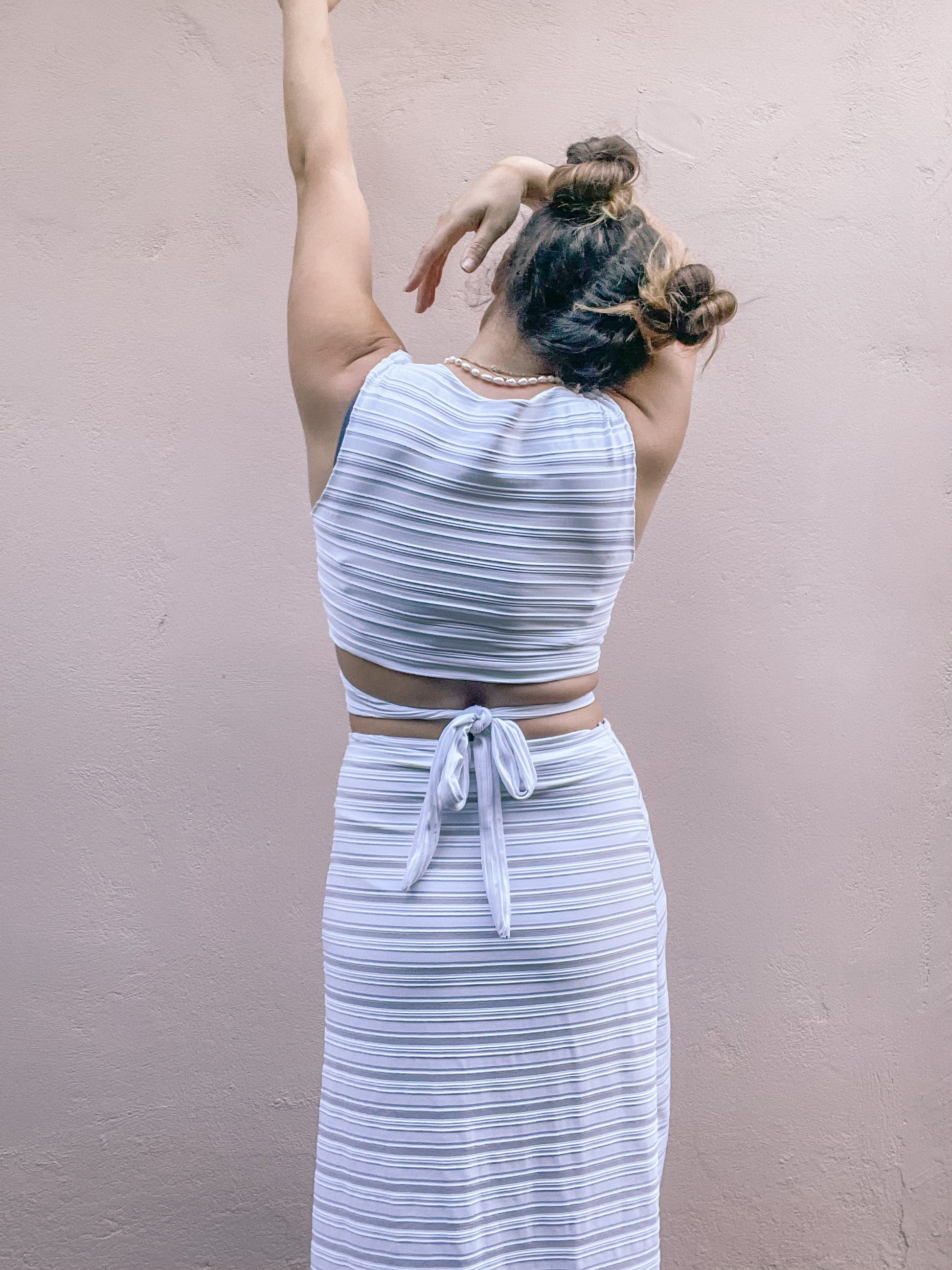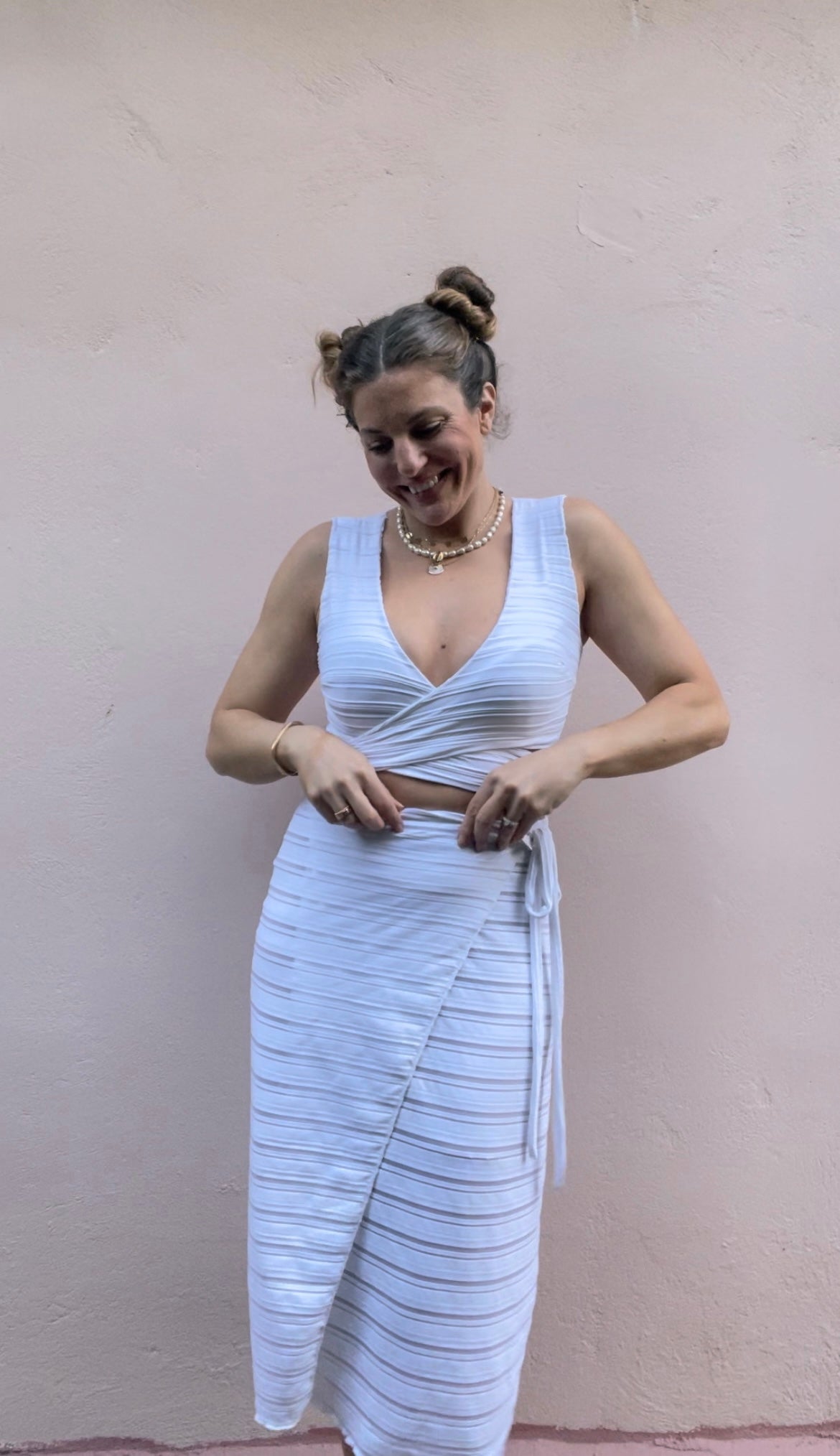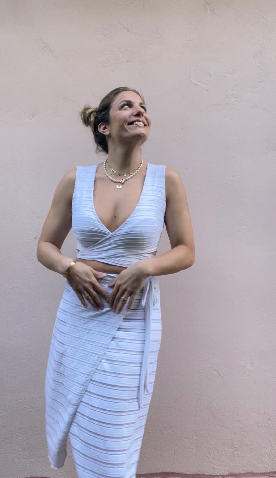 A polymorphic set meant to be worn everywhere, from morning walk to the office, to the beach, to island walks, a night out. Crossover top and crossover skirt to wear them as co-ords or separates in so many ways. Lightweight and anti-wrinkle. The skirt length is just under the knees. The skirt has see-through lines and comes with a nude mini skirt to cover. You can also wear it with your swimsuit at the beach. Style it with sandals, trainers or dress it up for an occasion with accessories and heels.