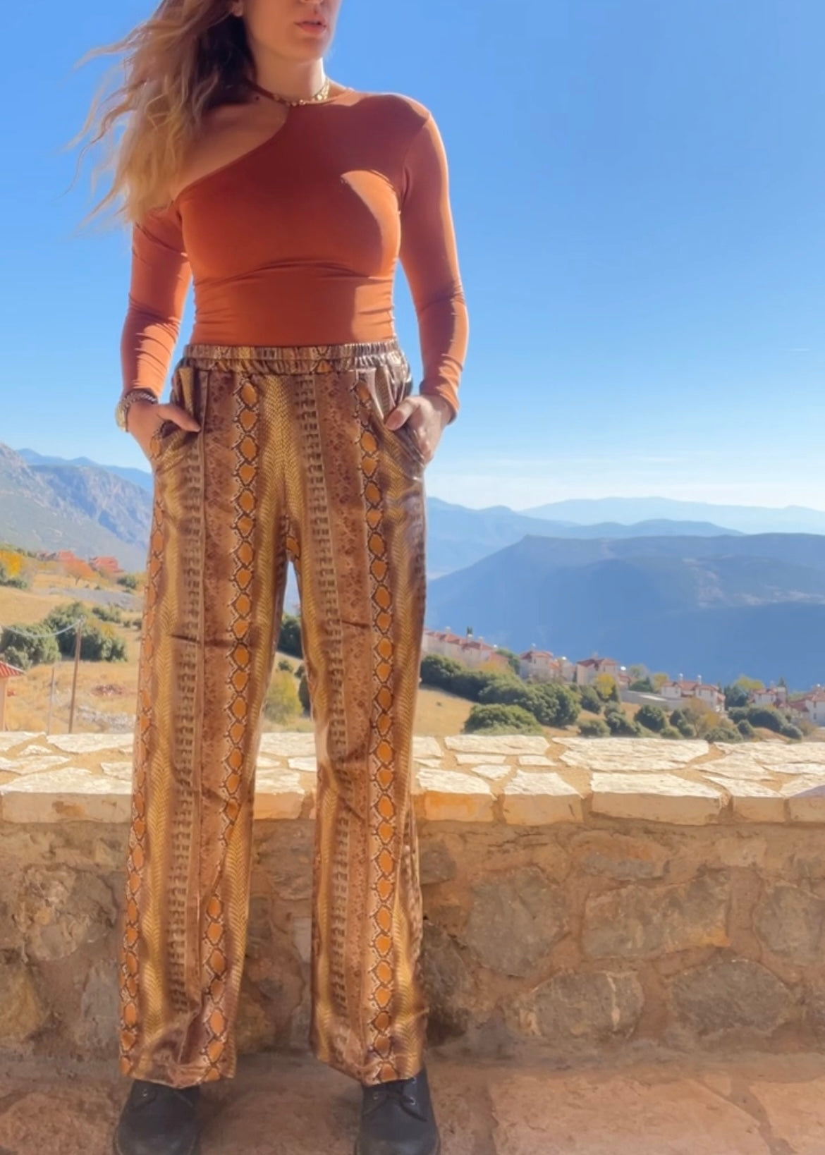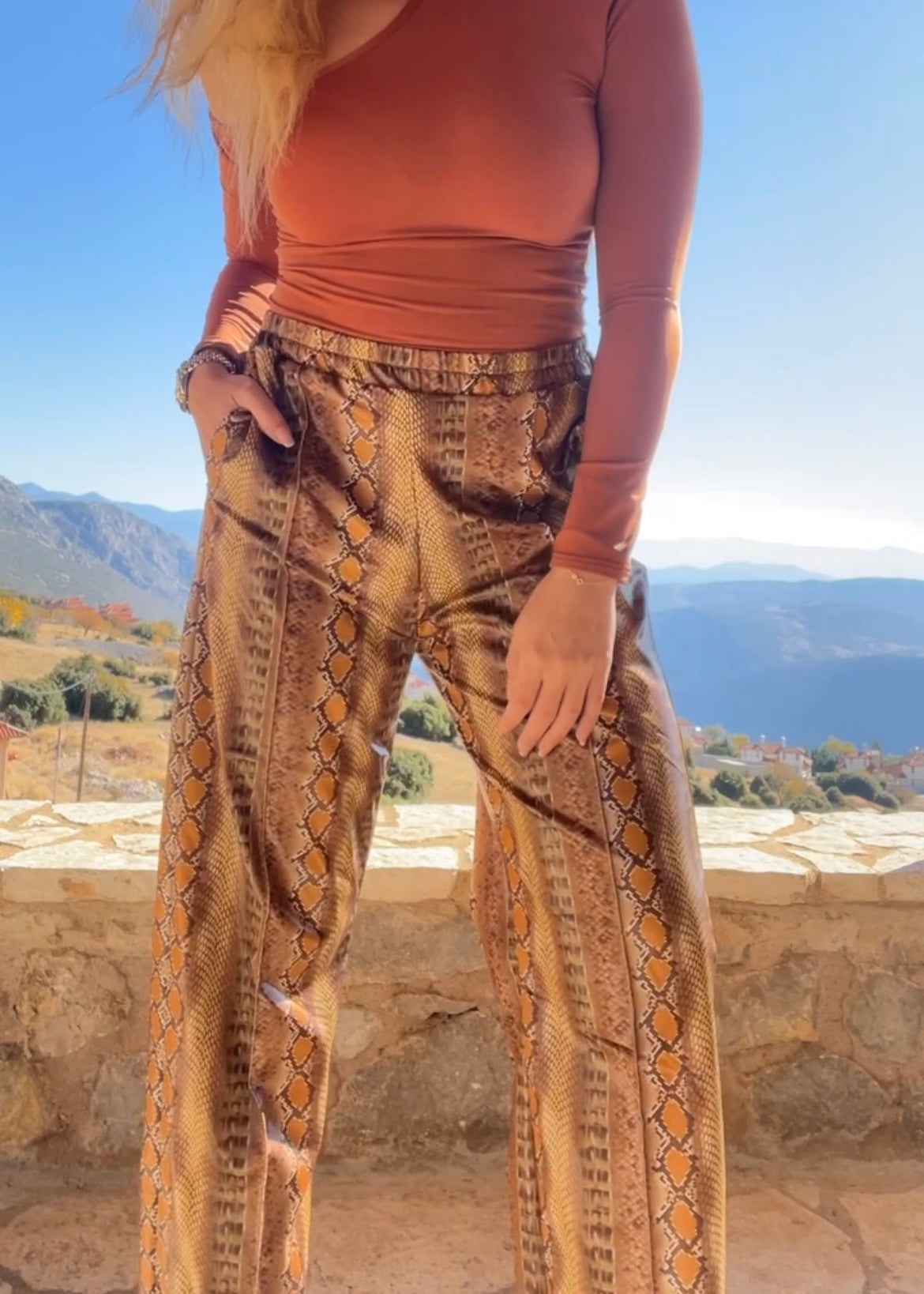 Gaia Snake Pants - featuring a bold snake print and sleek straight-leg cut. Made from soft, glossy fabric with functional pockets, they offer all-day comfort and versatility.