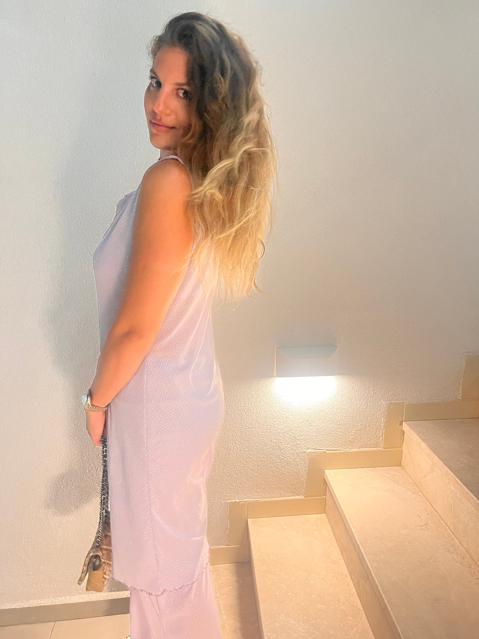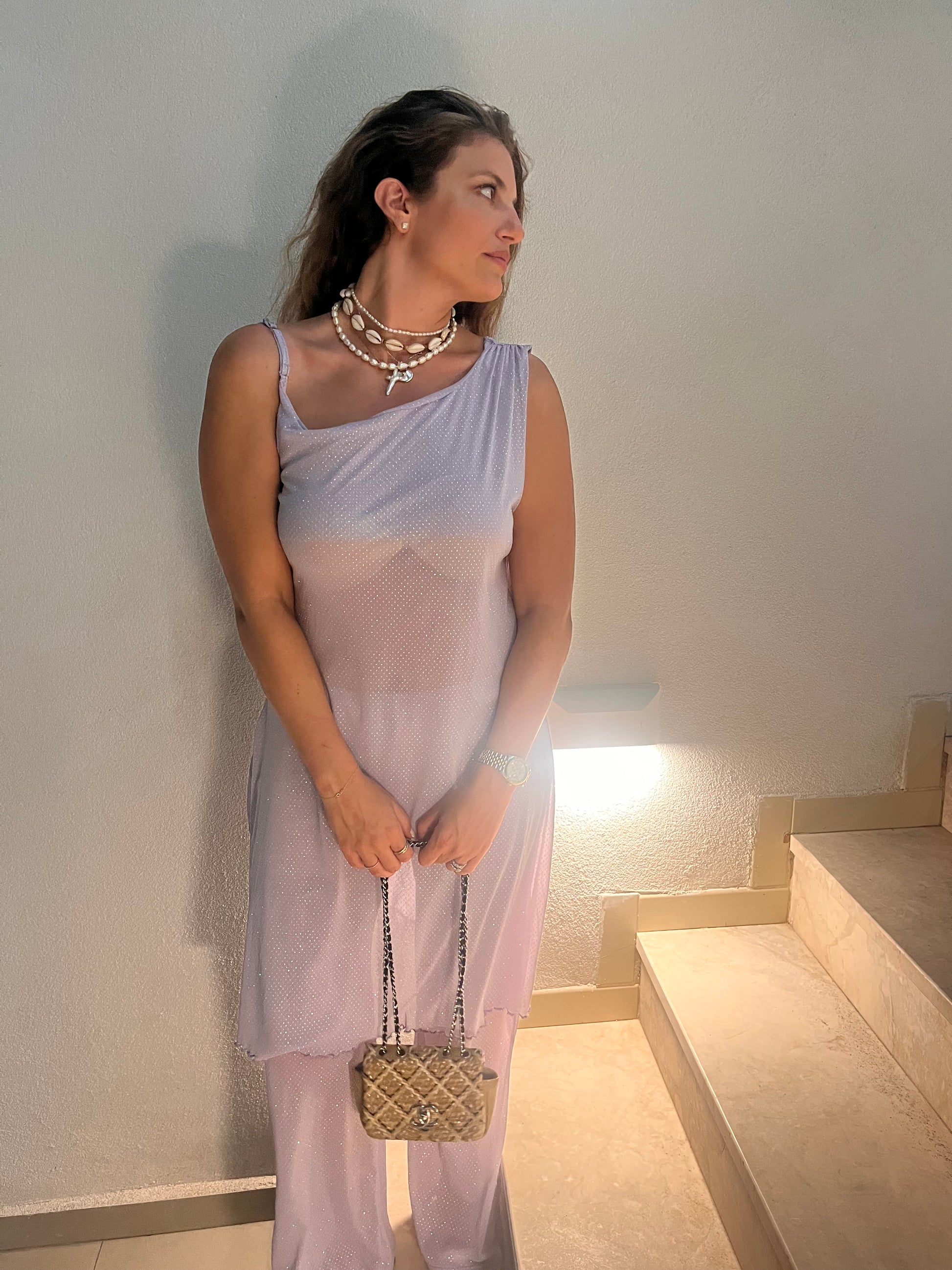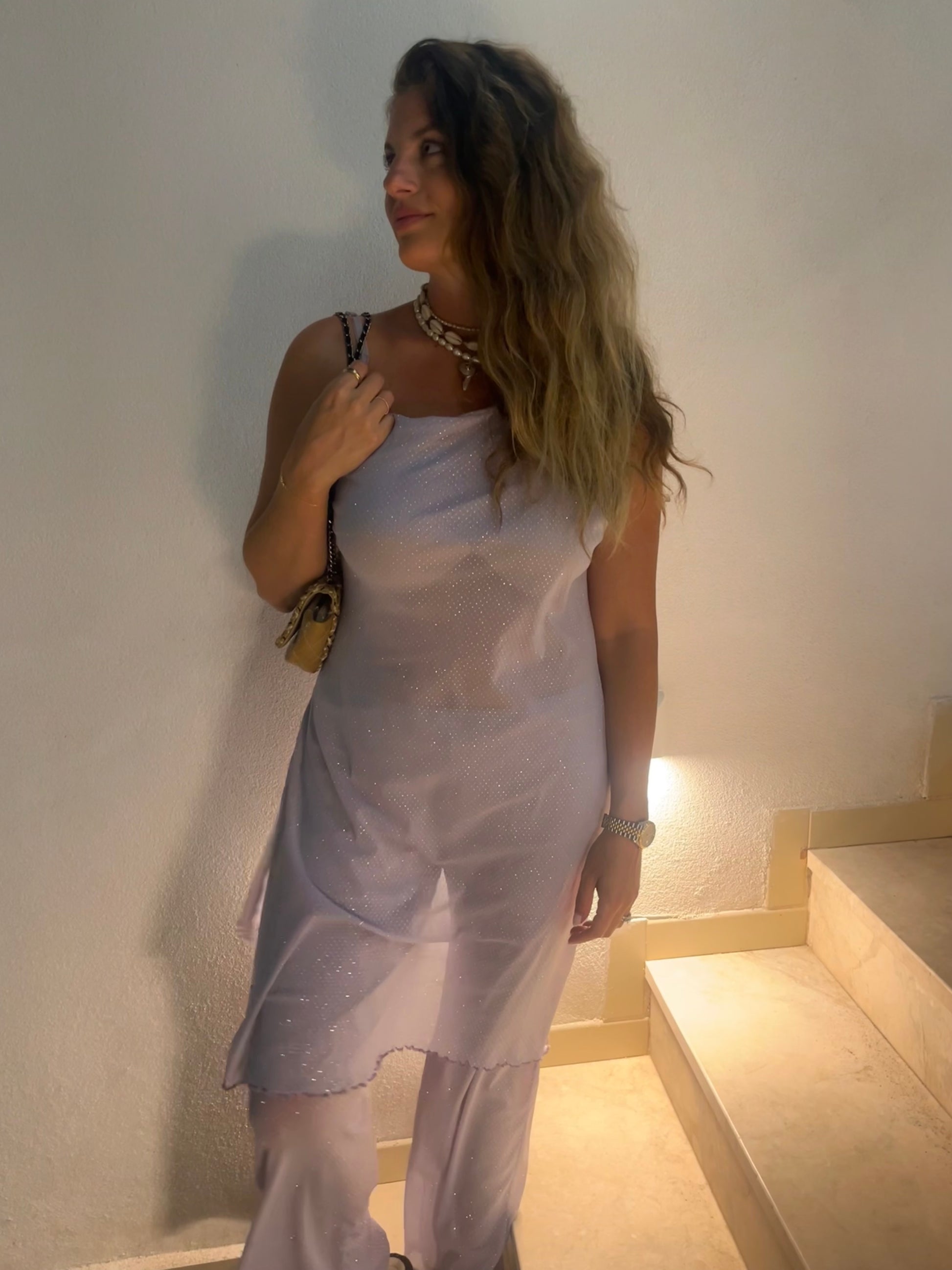 Effortlessly chic and feminine, this two-piece set in soft lilac features a flowy, semi-sheer tunic with a draped neckline and subtle glitter details. Paired with wide-leg matching pants, it's the perfect blend of comfort and elegance — ideal for warm evenings, vacation lounging, or stylish moments at home.