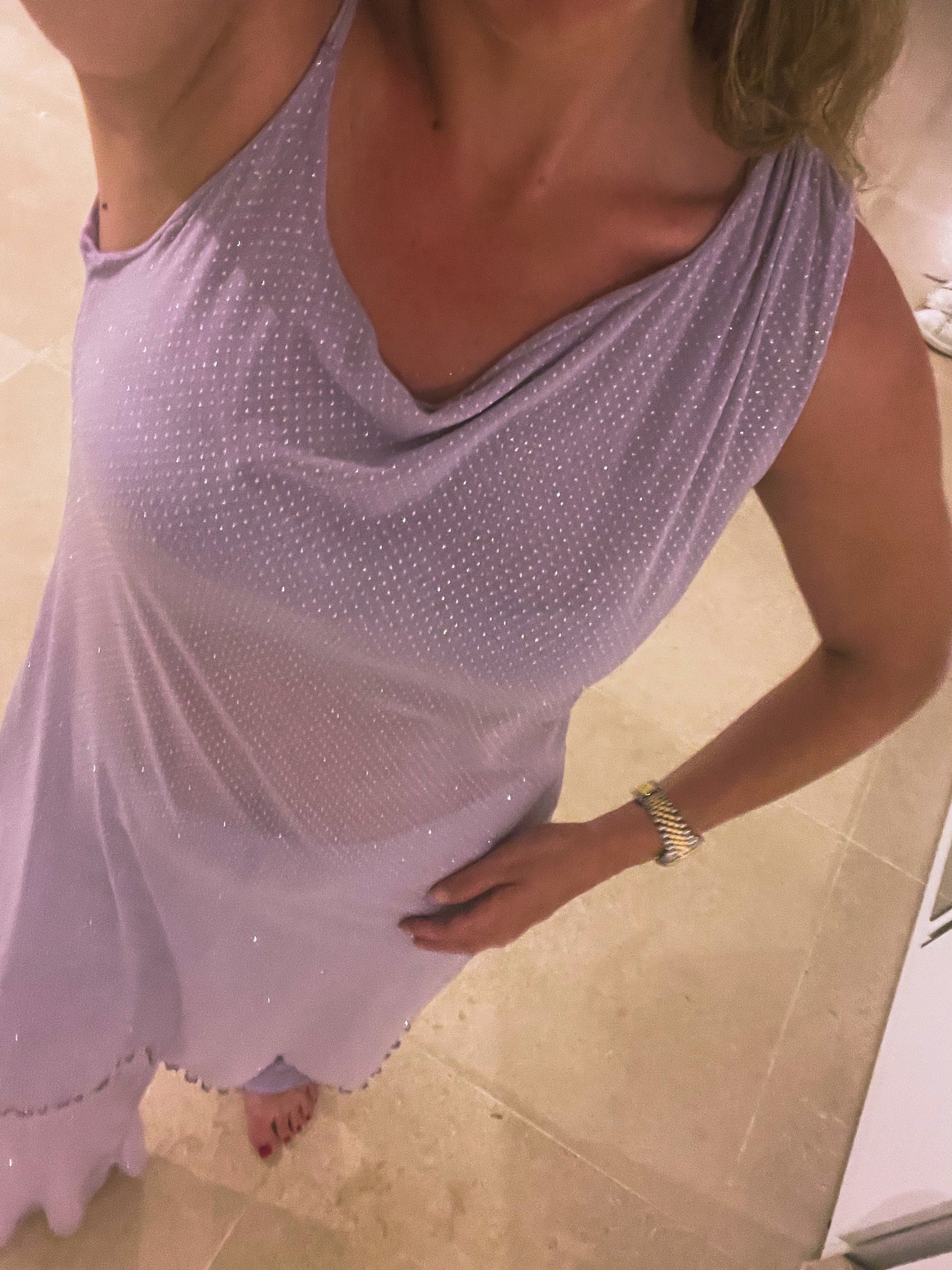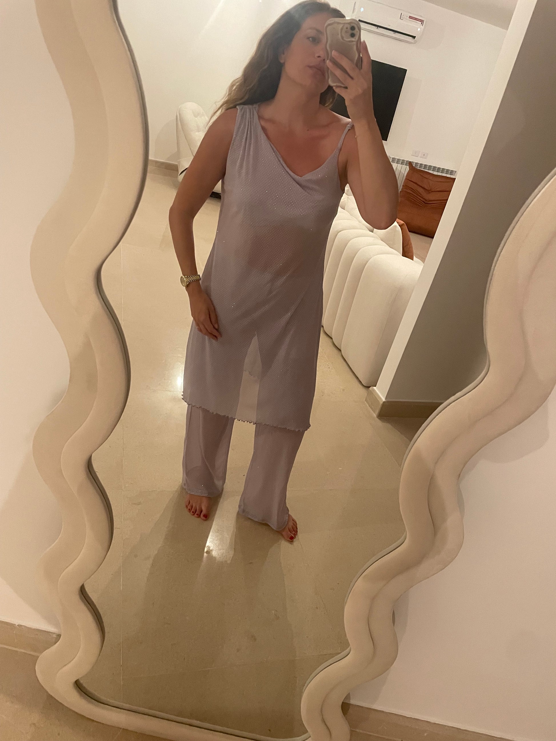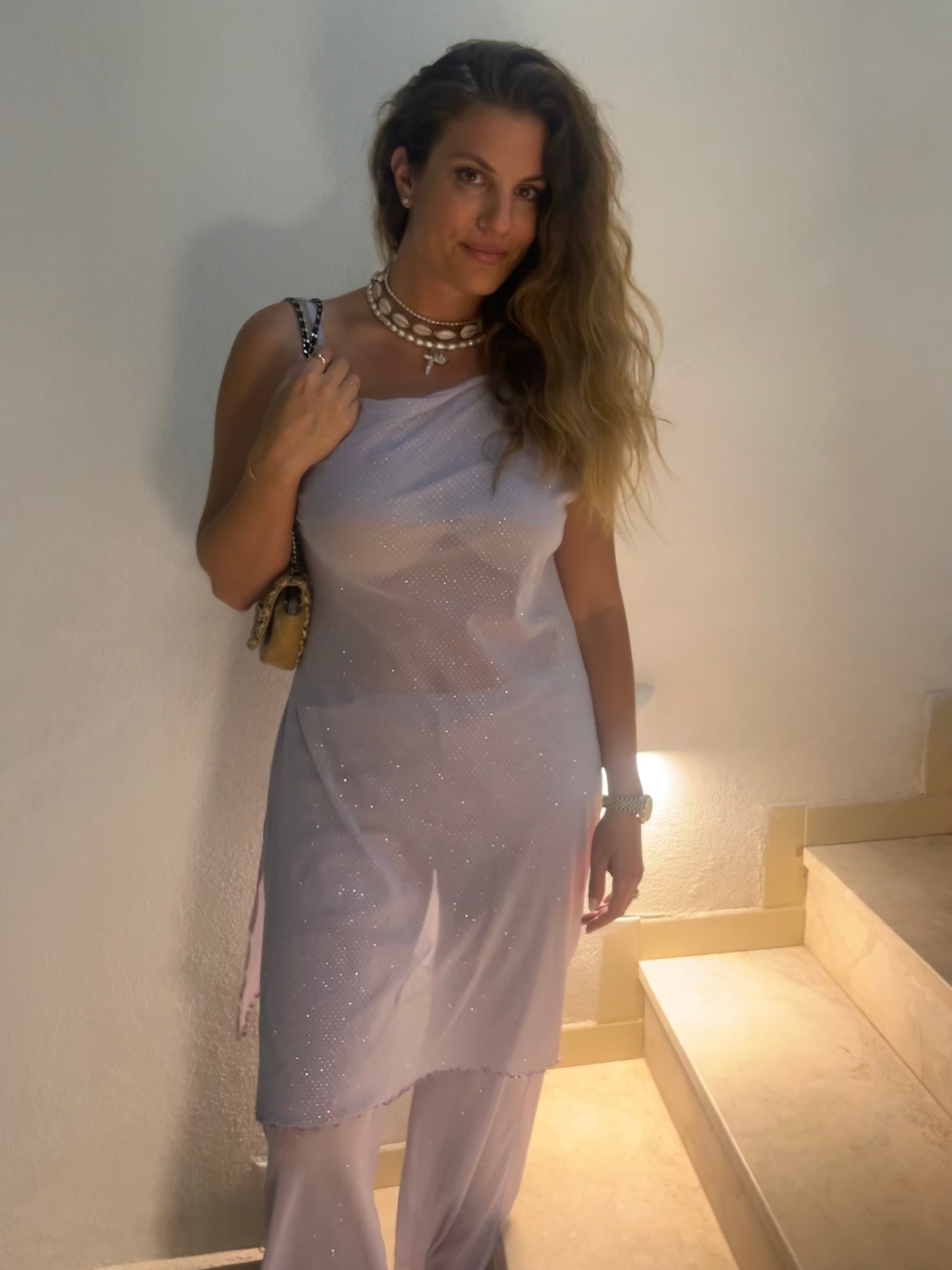 Effortlessly chic and feminine, this two-piece set in soft lilac features a flowy, semi-sheer tunic with a draped neckline and subtle glitter details. Paired with wide-leg matching pants, it's the perfect blend of comfort and elegance — ideal for warm evenings, vacation lounging, or stylish moments at home.