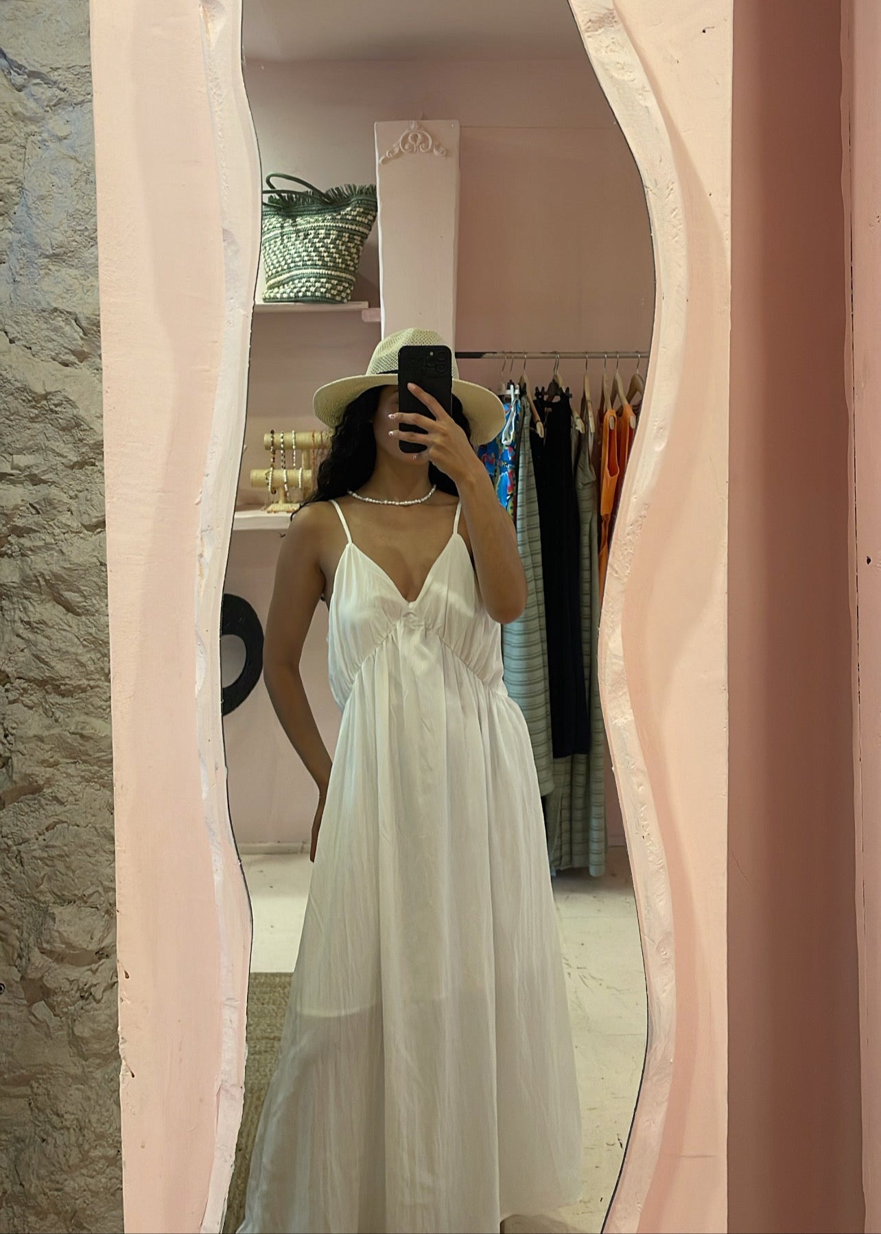 This long white summer dress features a breezy silhouette and a flattering V-neckline that adds a feminine and elegant touch. Made from lightweight, breathable fabric, it drapes gently over the body and falls gracefully to the ankles. Perfect for beach walks, garden parties, or warm summer evenings, this dress combines comfort with timeless elegance and is easy to style for various occasions.